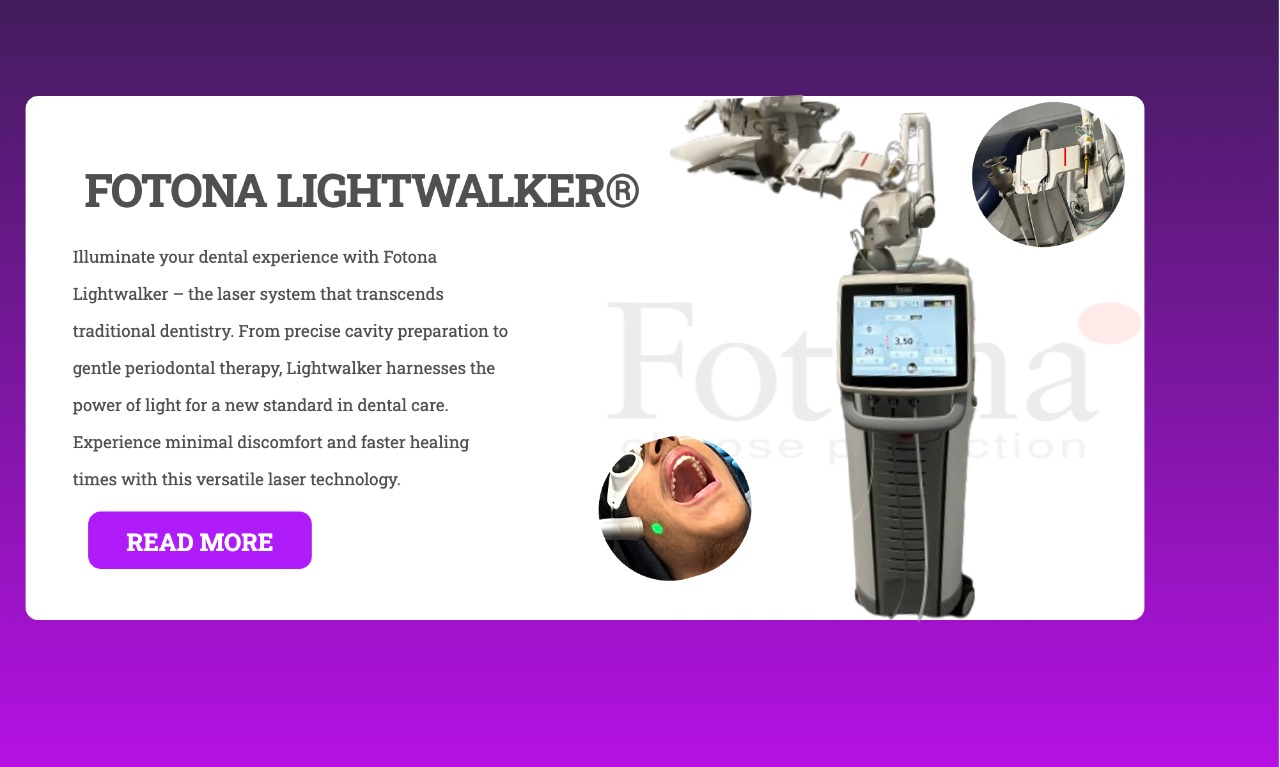 Illuminate your dental experience with Fotona Lightwalker – the laser system that transcends traditional dentistry. From precise cavity preparation to gentle periodontal therapy, Lightwalker harnesses the power of light for a new standard in dental care. Experience minimal discomfort and faster healing times with this versatile laser technology.